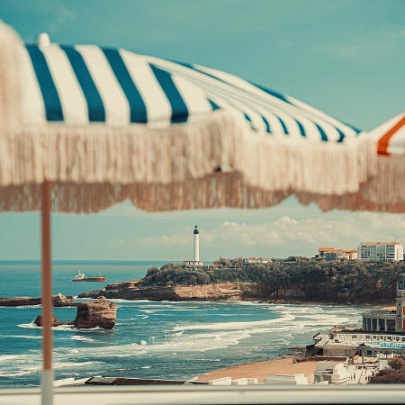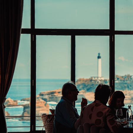 Avec son pavillon couvert et sa terrasse offrant une vue exceptionnelle sur la Grande Plage de Biarritz, notre rooftop vous accueille pour des apéros, des déjeuners « avec vue » inoubliables.